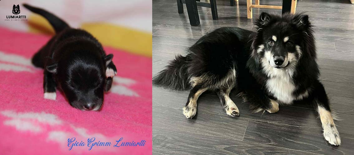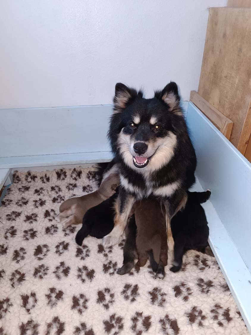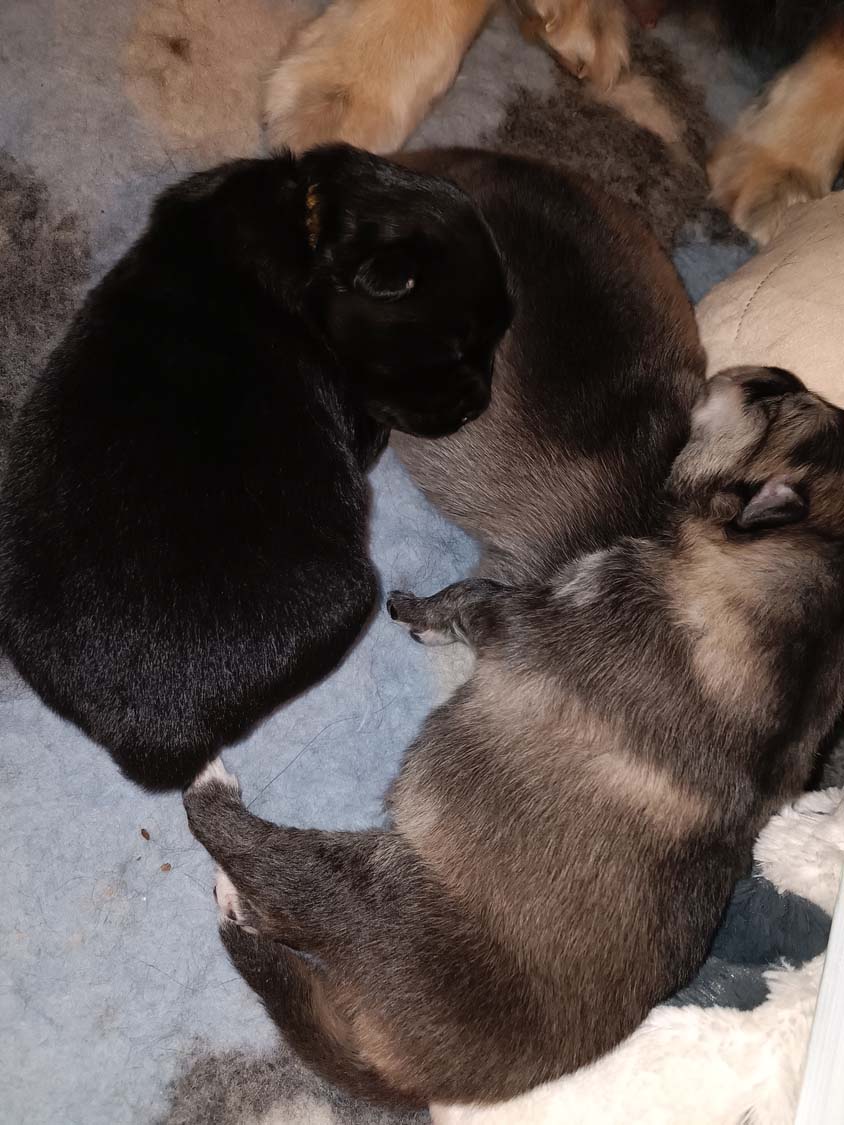 Pläne sind da um geändert zu werden. Da Hexe viel zu zeitig läufig geworden ist und ich keine Chance gehabt hätte mit den Welpen vom letzten Wurf noch hier in die Schweiz zu fahren, habe ich es riskiert mit Kiwi zum decken zu fahren. Vater des Wurfes wird der wunderbare Corry. Corry ist ein Rüde in der sehr seltenen Farbe rezessiv schwarz, auch Kiwis creme wird rezessiv vererbt, da die Besitzer von Corry eine große Genanalyse haben machen lassen, weiß ich dass er neben diesen schwarz auch braun und creme vererben kann. Und da auch Kiwis Gene bekannt sind, ergibt sich bei diesem Wurf die Möglichkeit auf 5 verschiedene Farben: creme, braun&tan, solid braun, black&tan sowie wie Papa Corry solid schwarz. Bei den beiden solid Varianten gibt es die Möglichkeit für die bei Lapphunden besondere Brillenzeichnung. Sprich die helle Ringe um die Augen.
