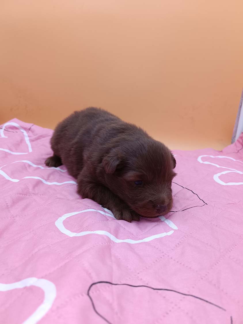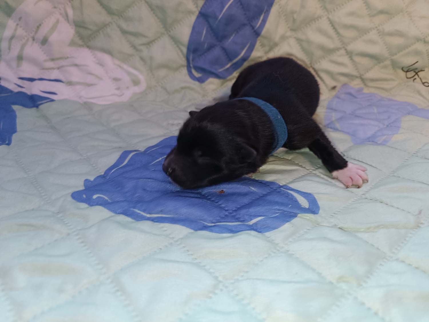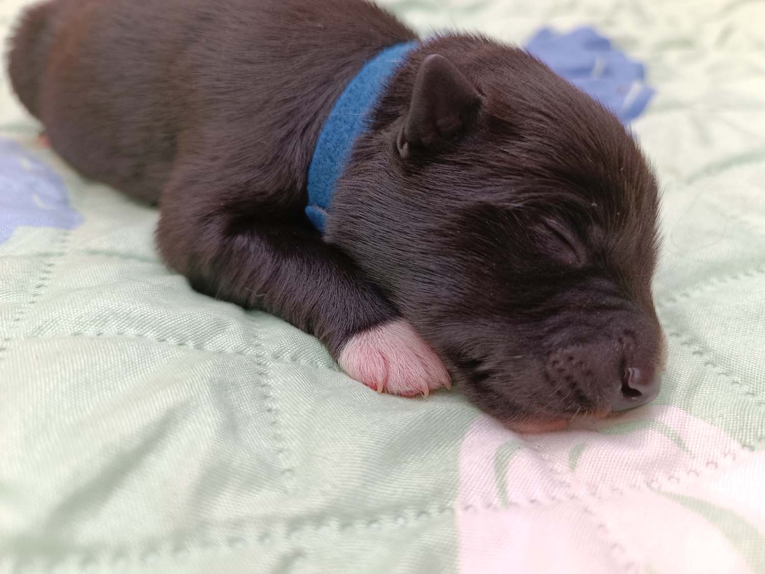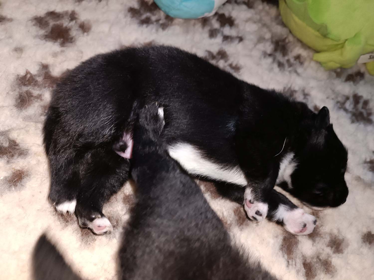 Bei der 3. Hündin bin ich mir noch nicht sicher welche Farbe sie mal haben wird. Ich denke schwarz, die Besitzerin vom Deckrüden meint sie erkenne ganz dezente Tan-Abzeichen. Ich sehe sie nicht wirklich, ich könnte theoretisch einen Gen-Test machen, dauert etwa 4-5 Wochen, bis dahin vermute ich aber dass wenn es wirklich tan abzeichen sind, sie deutlicher werden. Diese Abzeichen bilden sich auch erst innerhalb des ersten Lebensjahres richtig aus.