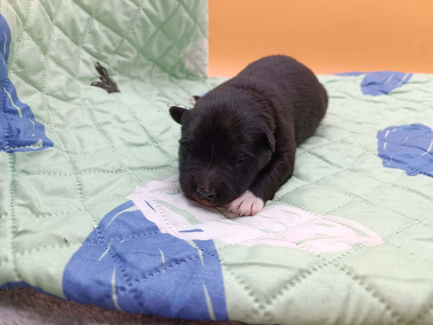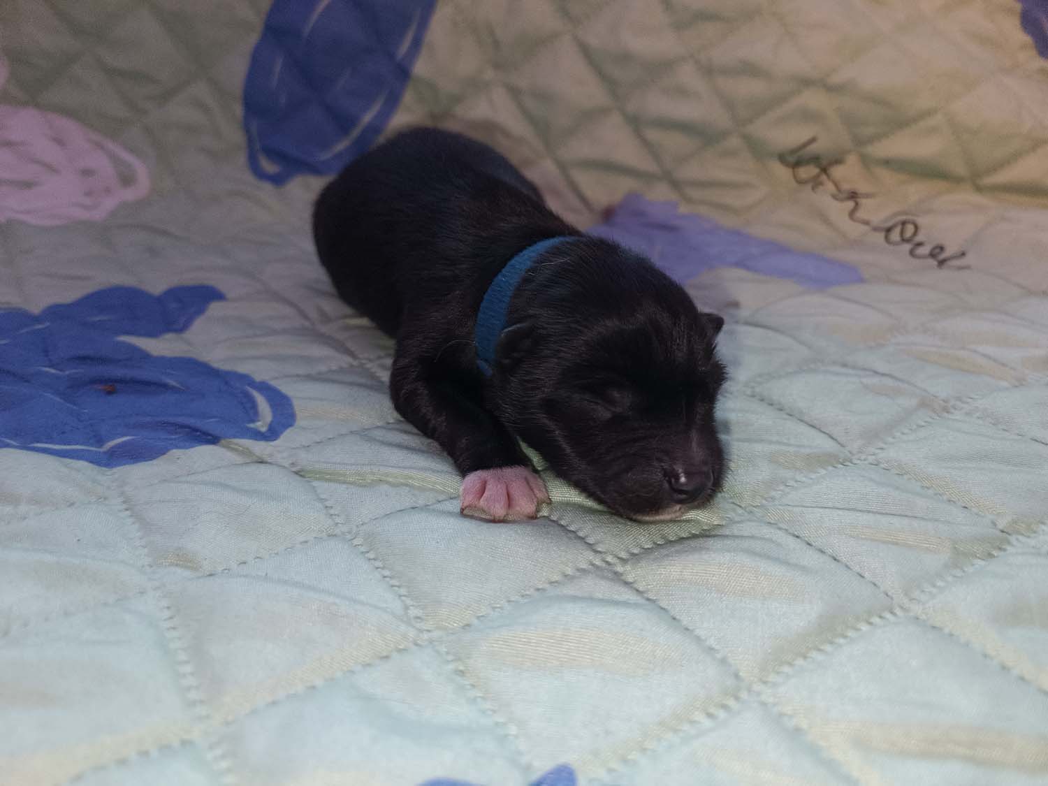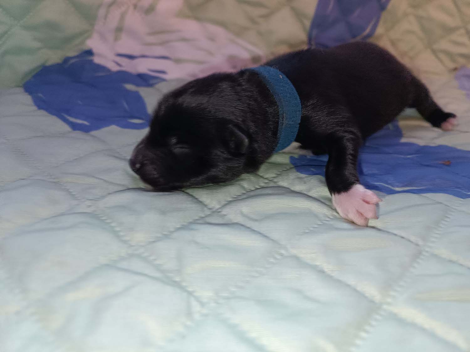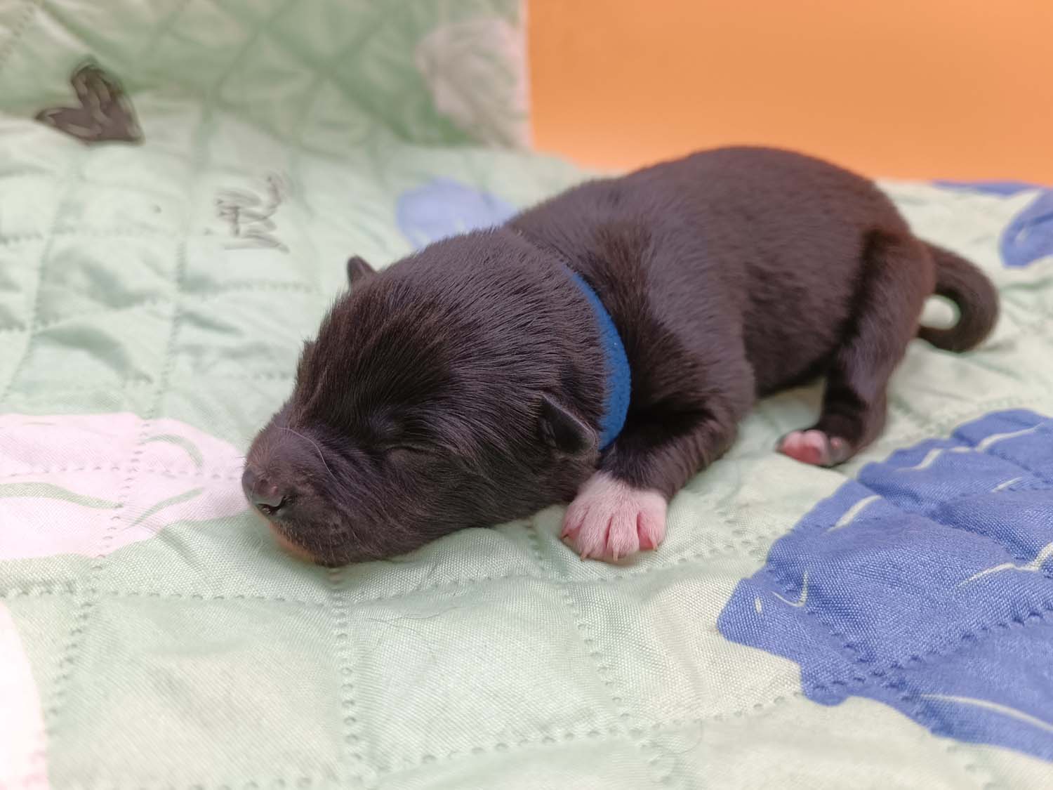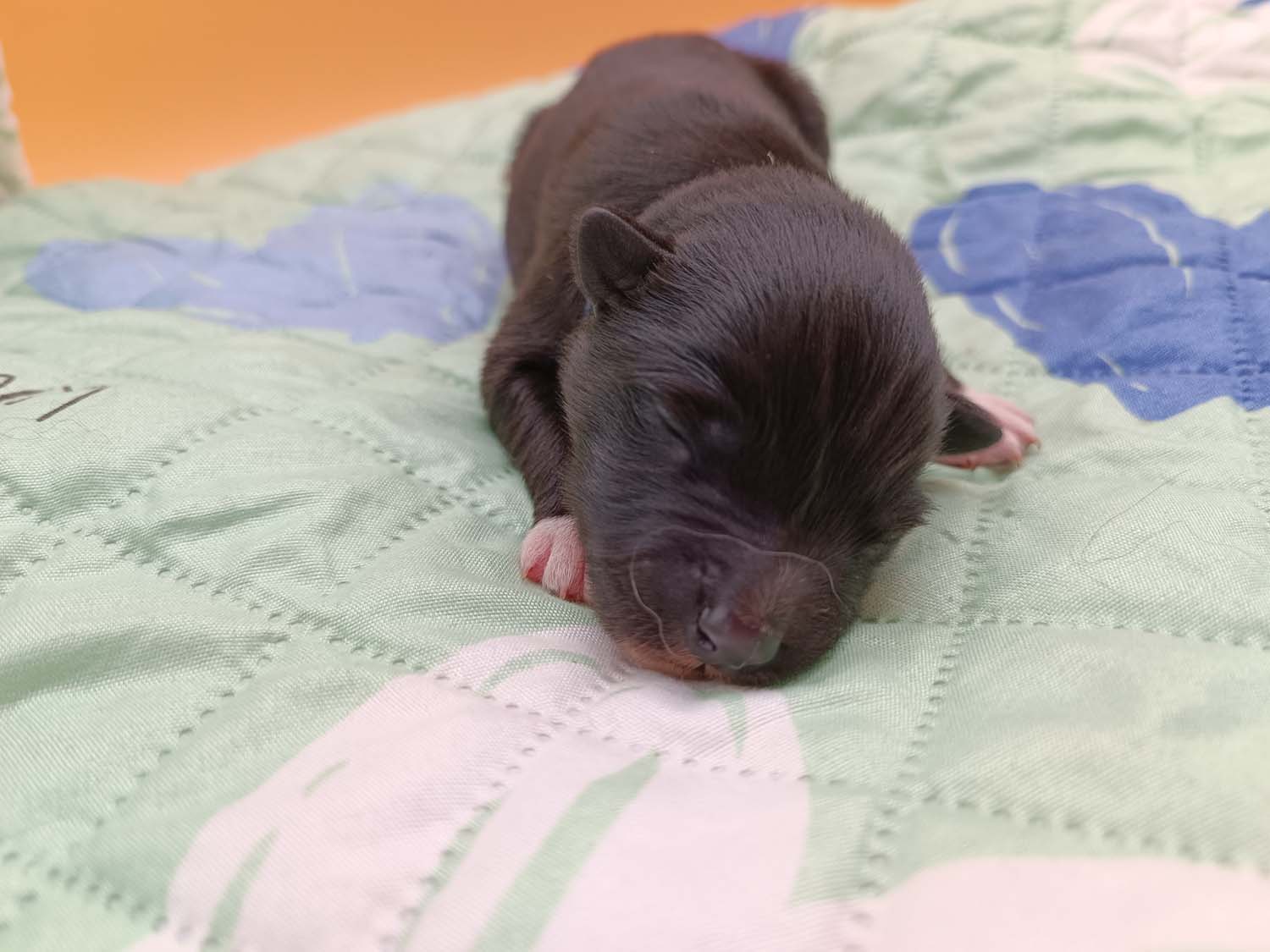 Bei der 3. Hündin bin ich mir noch nicht sicher welche Farbe sie mal haben wird. Ich denke schwarz, die Besitzerin vom Deckrüden meint sie erkenne ganz dezente Tan-Abzeichen. Ich sehe sie nicht wirklich, ich könnte theoretisch einen Gen-Test machen, dauert etwa 4-5 Wochen, bis dahin vermute ich aber dass wenn es wirklich tan abzeichen sind, sie deutlicher werden. Diese Abzeichen bilden sich auch erst innerhalb des ersten Lebensjahres richtig aus.