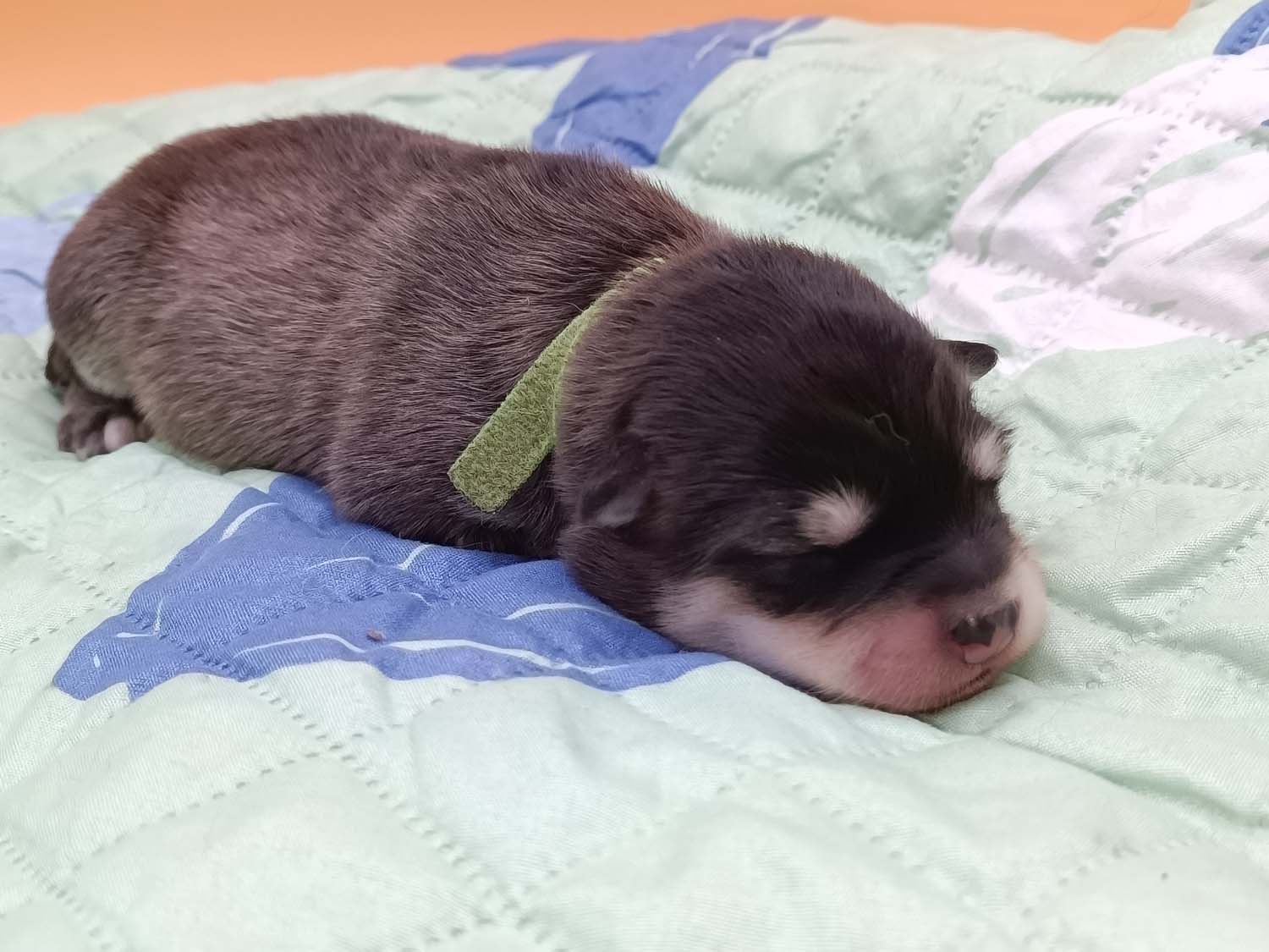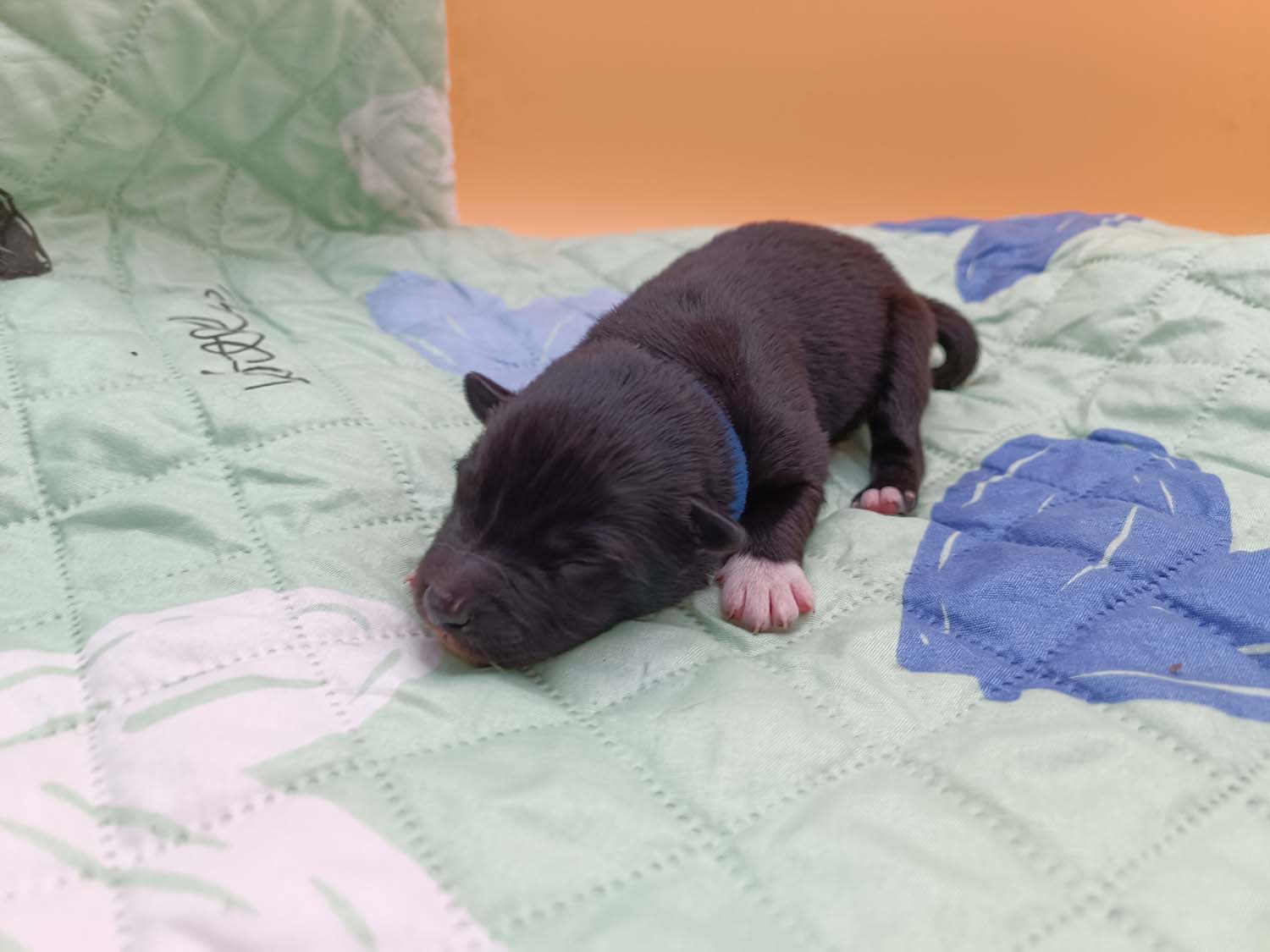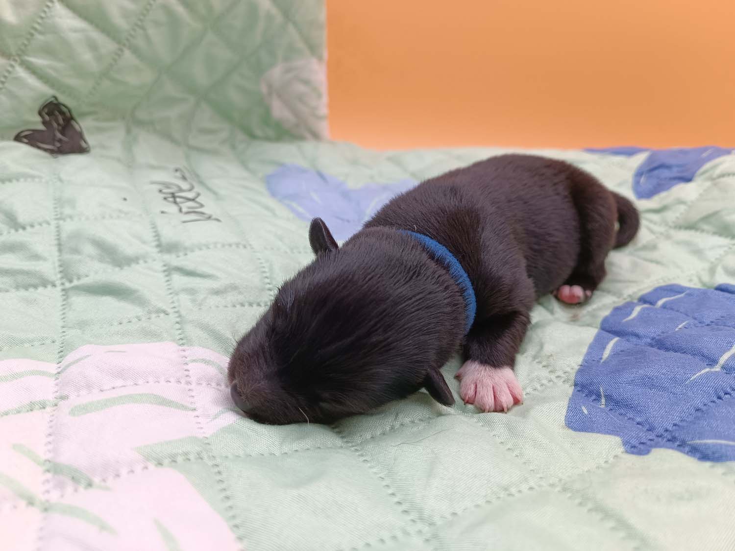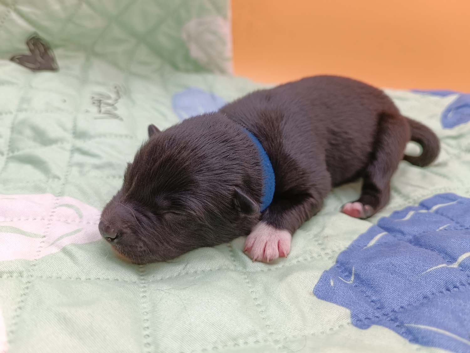 Bei der 3. Hündin bin ich mir noch nicht sicher welche Farbe sie mal haben wird. Ich denke schwarz, die Besitzerin vom Deckrüden meint sie erkenne ganz dezente Tan-Abzeichen. Ich sehe sie nicht wirklich, ich könnte theoretisch einen Gen-Test machen, dauert etwa 4-5 Wochen, bis dahin vermute ich aber dass wenn es wirklich tan abzeichen sind, sie deutlicher werden. Diese Abzeichen bilden sich auch erst innerhalb des ersten Lebensjahres richtig aus.