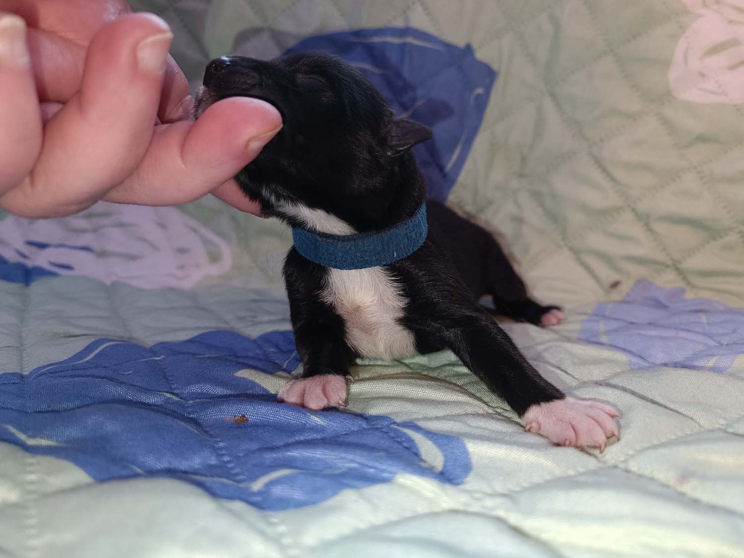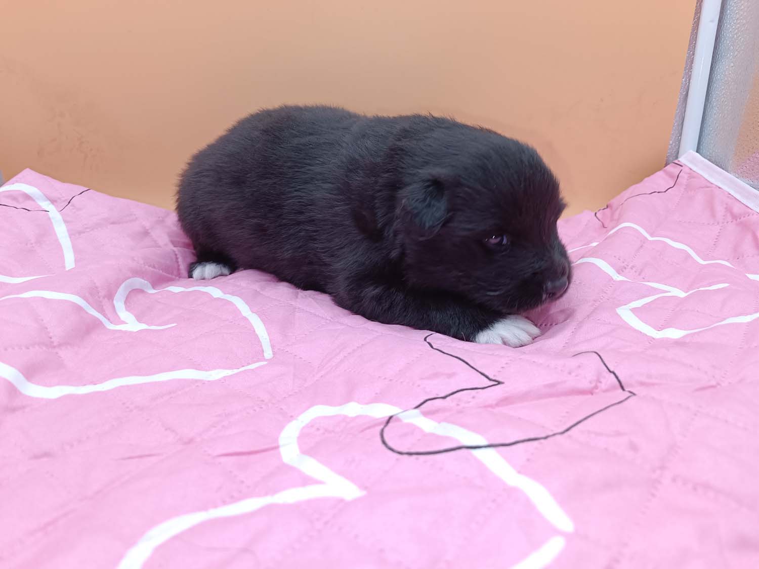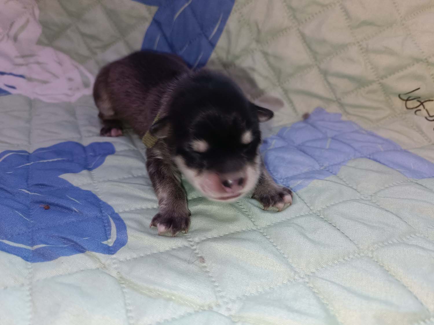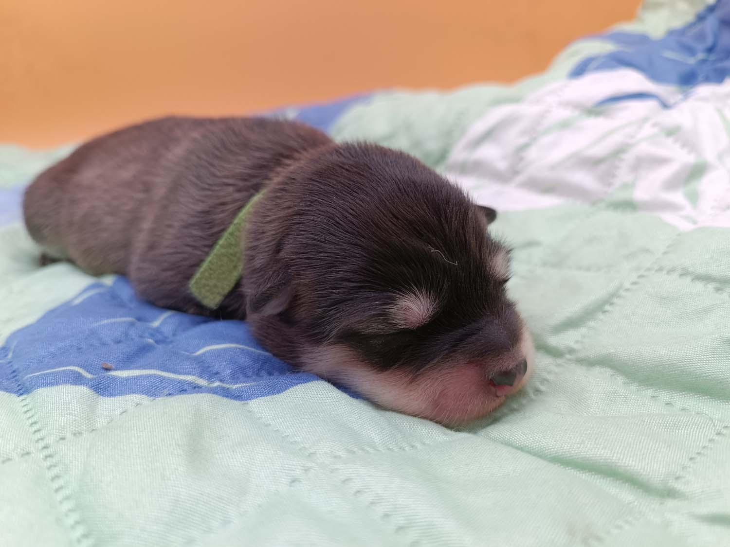 Bei der 3. Hündin bin ich mir noch nicht sicher welche Farbe sie mal haben wird. Ich denke schwarz, die Besitzerin vom Deckrüden meint sie erkenne ganz dezente Tan-Abzeichen. Ich sehe sie nicht wirklich, ich könnte theoretisch einen Gen-Test machen, dauert etwa 4-5 Wochen, bis dahin vermute ich aber dass wenn es wirklich tan abzeichen sind, sie deutlicher werden. Diese Abzeichen bilden sich auch erst innerhalb des ersten Lebensjahres richtig aus.