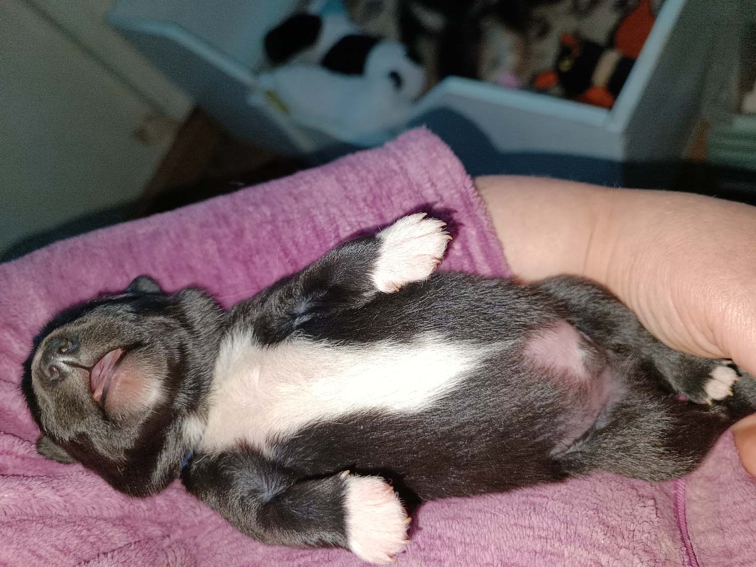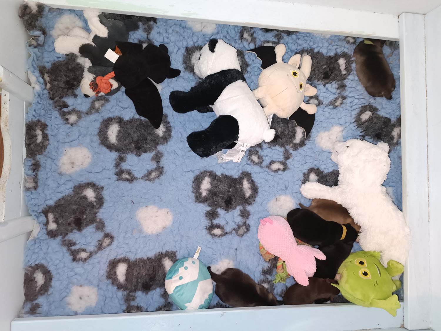 Die Welpen sind nun schon wieder 12 Tage alt und wachsen wie am Spieß. Klein Hatysa hat mich heute auch schon mit einem Auge angezwinkert. Die beiden dicken Mädels haben die Marke Mehltüte geknackt aka wiegen mehr als 1 kg jetzt und ähneln doch eher Robben als Hunden. Man sieht in den Fotos/Video auch, dass einige Plüschtiere in der Wurfbox eingezogen sind, die Welpen spielen noch nicht damit, es dient als Kissen bzw. als Hinternisse, damit die Welpen nicht immer komplett flach wie kleine Flundern liegen. Dieses Flache liegen, kann zu einem abflachen des Brustkorbes führen, was nicht wirklich ideal ist.