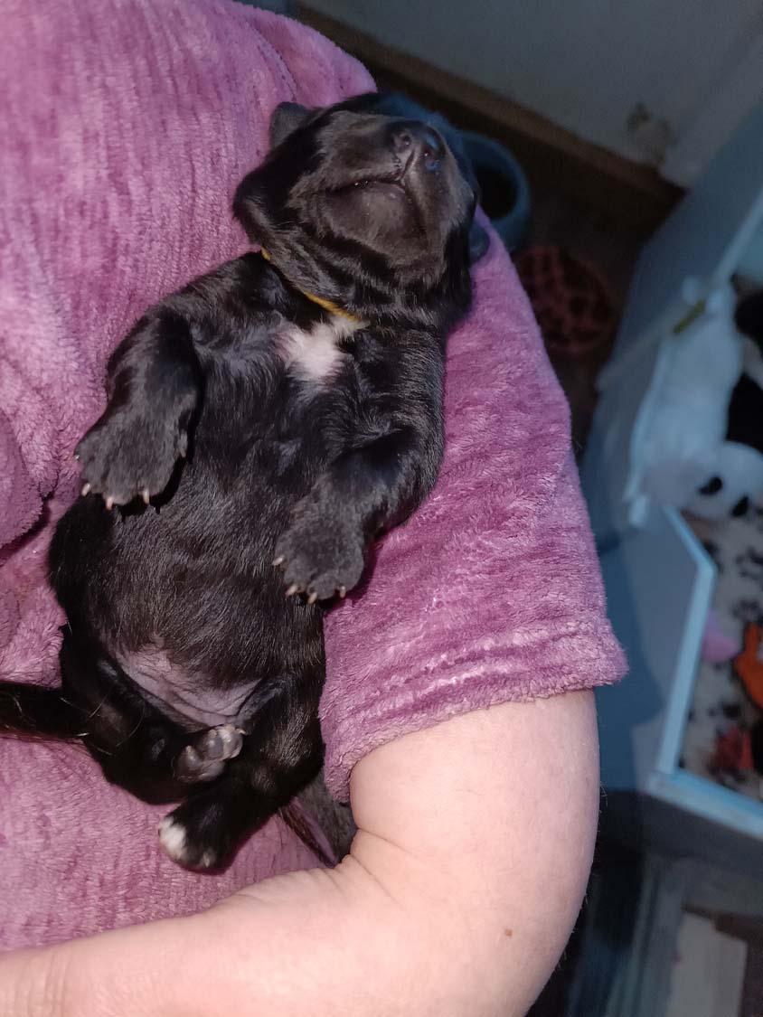 Nachdem Hexe die ersten Tage sehr zickig unterwegs war, bin ich am Montag zur Tierärztin gefahren, um den Calcium-Wert bestimmen zu lassen. Manchmal kann es durch einen niedrigen Calciumwert zu Zickigkeit kommen, der war aber im Normbereich und die letzten beiden Tage ist sie auch etwas ruhiger geworden. Zickt zwar die anderen Hunde trotzdem noch an, aber nimmt sich nun auch mal 5min Auszeit und kommt zum kuscheln. Allerdings ich gebe es zu, man möchte nicht unbedingt von ihr momentan angehechelt werden. Das Putzen der Kleinen hinterlässt einen etwas intensiven Atem. Solange die Welpen ruhig sind, kann ich auch nun die Welpen aus der Wurfbox nehmen, ohne das Hexe sofort hinterher springt. Diese drei, sind meine Genießer, und beim Bauchkraulen direkt mal eingeschlafen. Die drei Dominos waren da nicht ganz so ruhig und das verursacht, dann doch noch Stress bei Hexe.