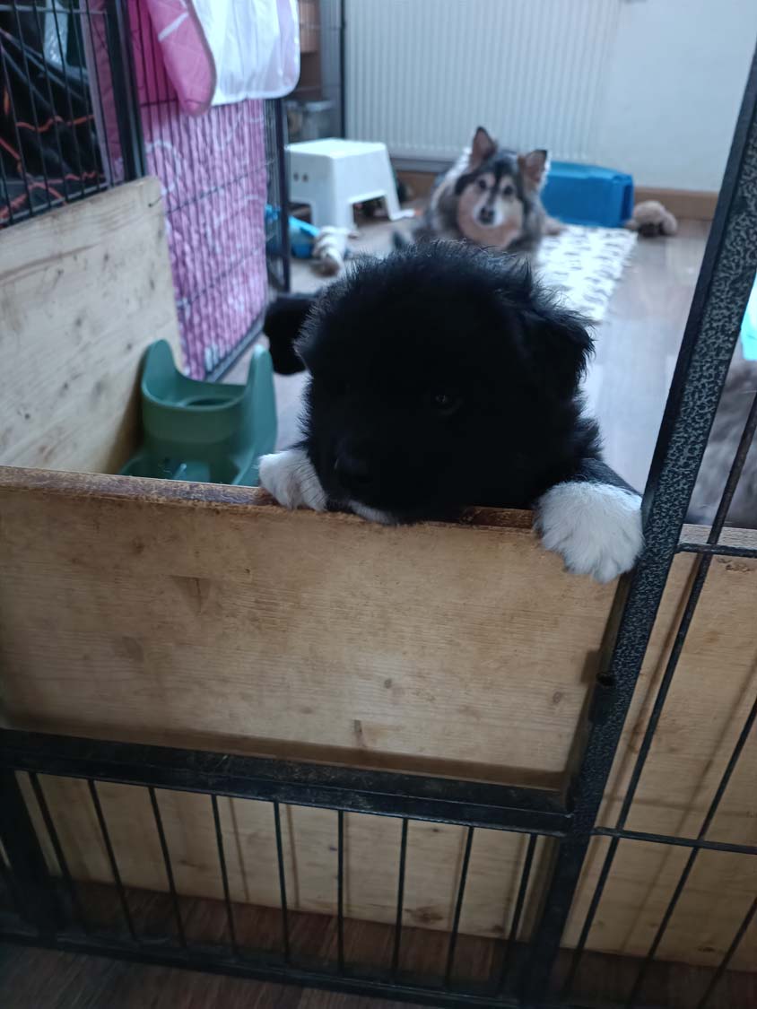 Ich bin gefragt worden warum ich die Welpen immer von außerhalb filme, denke nicht, dass jemand Interesse hat für 10min meine Füße und Bein zu betrachten ;). Die Welpen suchen nun immer mehr auch aktiv den Kontakt zu mir.