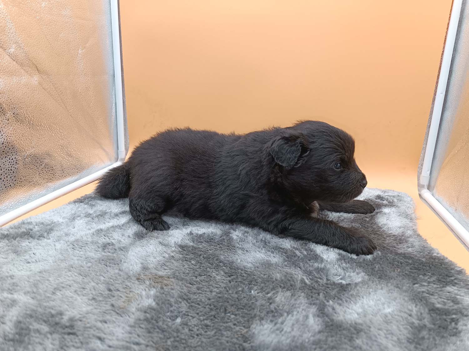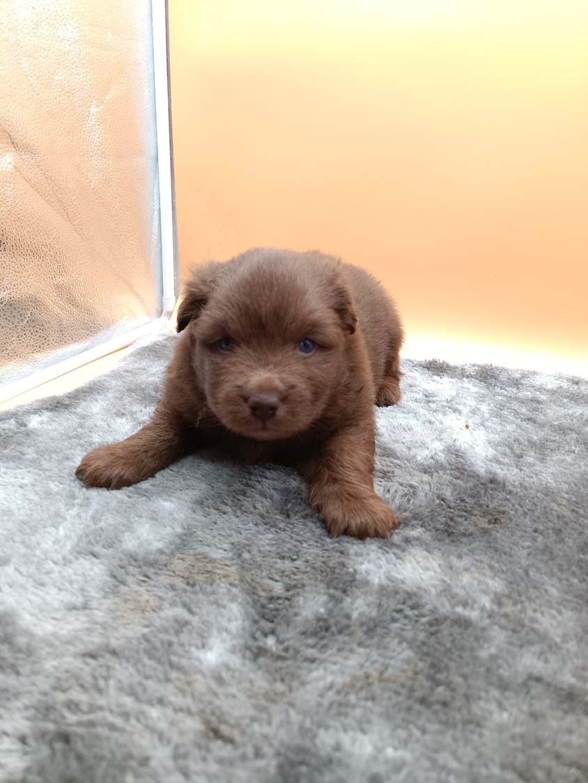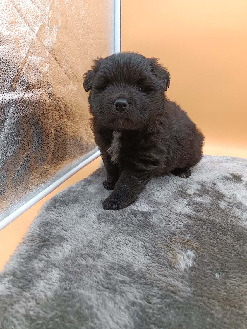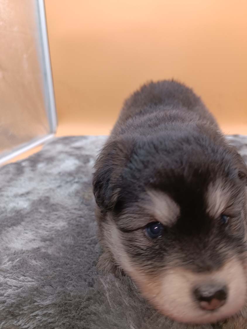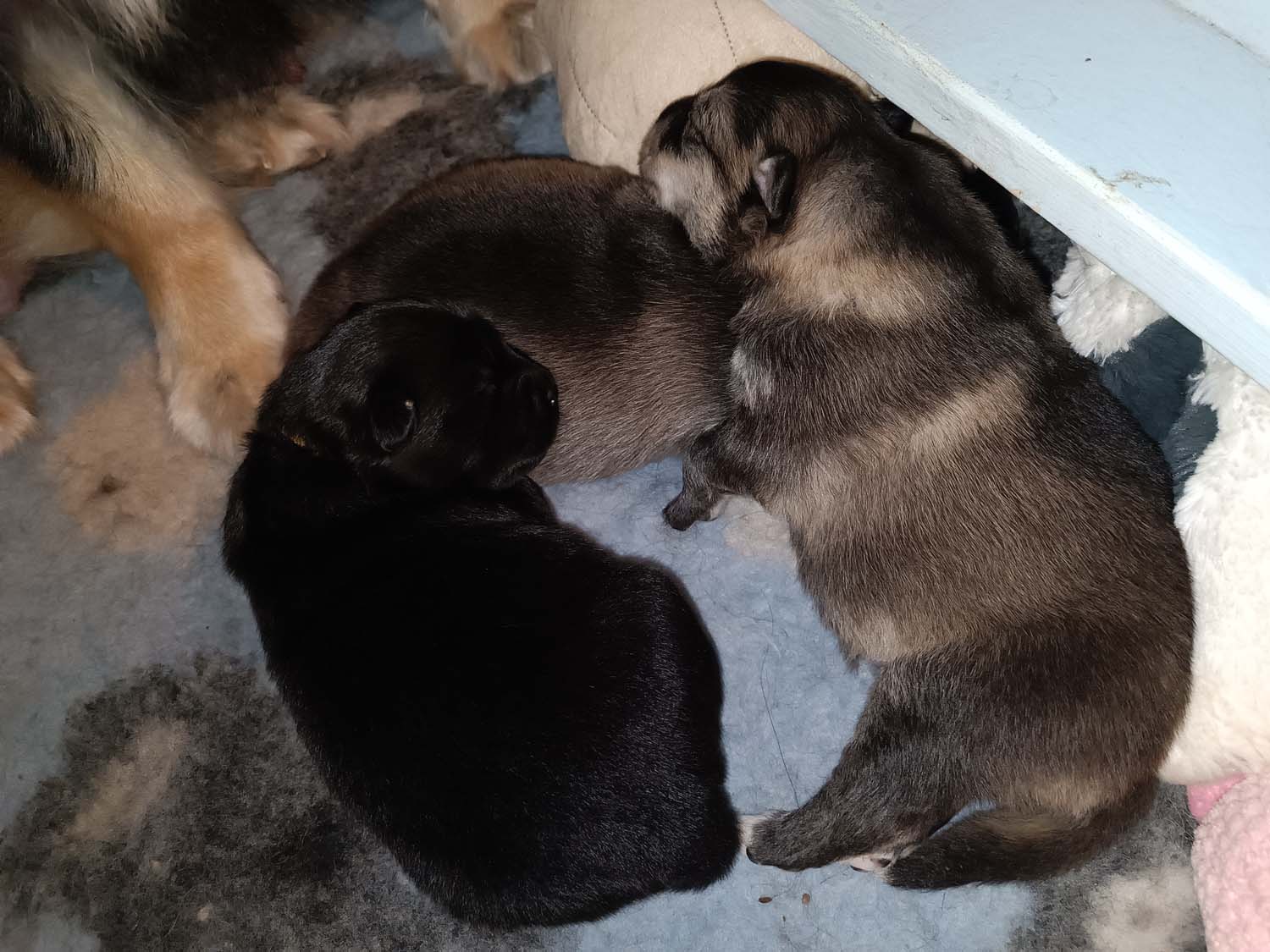 Bei der 3. Hündin bin ich mir noch nicht sicher welche Farbe sie mal haben wird. Ich denke schwarz, die Besitzerin vom Deckrüden meint sie erkenne ganz dezente Tan-Abzeichen. Ich sehe sie nicht wirklich, ich könnte theoretisch einen Gen-Test machen, dauert etwa 4-5 Wochen, bis dahin vermute ich aber dass wenn es wirklich tan abzeichen sind, sie deutlicher werden. Diese Abzeichen bilden sich auch erst innerhalb des ersten Lebensjahres richtig aus.