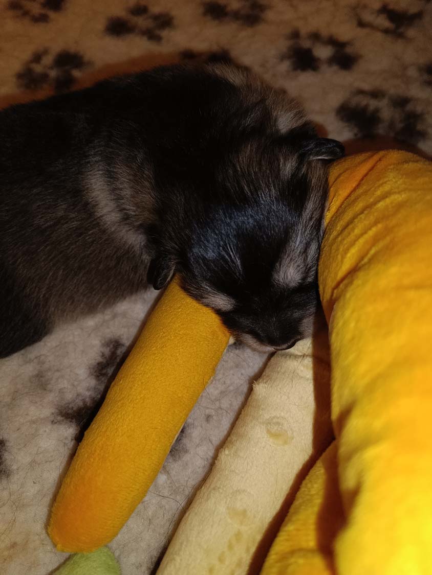 Kurze Story. Am Freitag, hatte ich den Großen Rinderohren zum knabbern gegeben. Hexe hat sich erst eins geholt, kam dann aber wieder und wollte noch ein zweites. Hexe bekommt was sie möchte, also hab ich ihr ein zweites Rinderohr gegeben. Das sie dann in die Wurfbox geschafft hat. Nur leider wissen die Zwerge noch nichts damit anzufangen und als Kuschelkissen ist es nicht ganz so geeignet. Am nächsten Tag war Hexis Appetit dann aber doch zu groß und sie hat es selbst geknabbert.